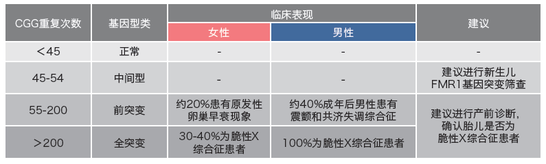 由于男性只有一条X染色体而更容易患病,大约4000个人当中就有一个患者;女性发病率比较低,但中国女性前突变携带率约1/1000,且存在动态突变,即女性携带者更容易生出全突变患儿。根据美国脆性X基金会(National Fragile X Foundation)资料,女性携带者生出患者的机率可高达1/2!因此对育龄妇女进行产前或孕前FMR1基因检测,进而指导生育显得尤为重要。
