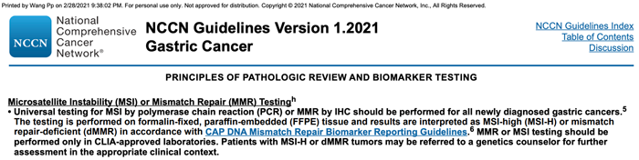 2021年V1版胃癌NCCN指南做出重要更新,建议所有的新诊断的胃癌患者进行MSI/MMR常规检测[1]。
