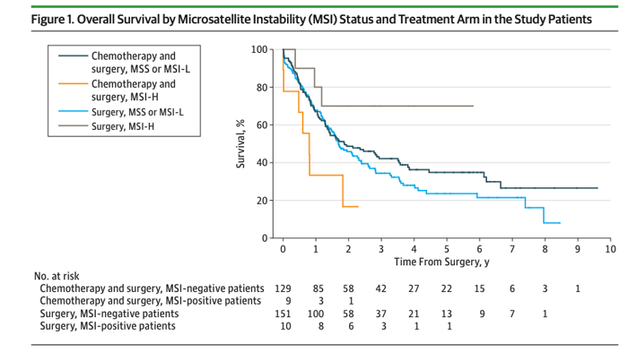 Filippo Pietrantonio等人[5]对MAGIC、CLASSIC、ARTIST和ITACA-S试验纳入的可切除性胃癌患者进行了一项多国meta分析,结论显示在可切除的原发性胃癌患者中,MSI与DFS和OS独立相关,是一个可靠的预后指标,并提示对于接受手术的MSI-H的胃癌患者,围手术期或辅助化疗可能缺乏益处。