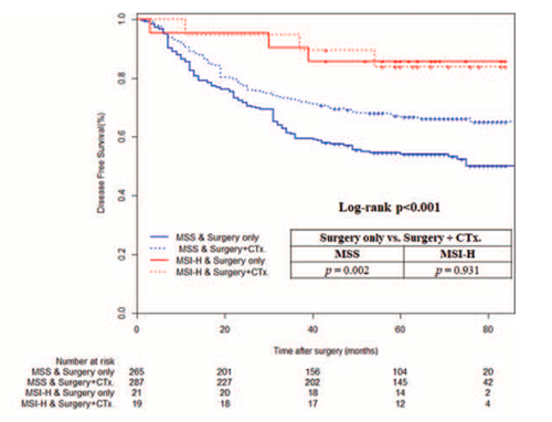 在CLASSIC研究中辅助性卡培他滨加奥沙利铂方案确立为可切除胃癌的亚洲患者的标准,在Choi 等人[4]对CLASSIC研究的二级分析中,MSI-H 型胃癌的患者未从辅助化疗中获益(5年DFS化疗组vs单独手术组:83.9% vs 85.7%; P=0.931)。
