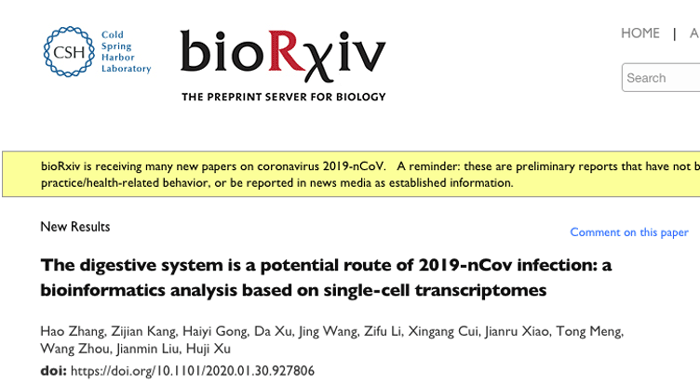 2020年1月31日,上海第二军医大学附属长征医院徐沪济团队等在 bioRxiv发表文章。其团队依然基于公开的数据库,对肺部和消化道中的不同组织细胞进行了单细胞层面的分析[3]。