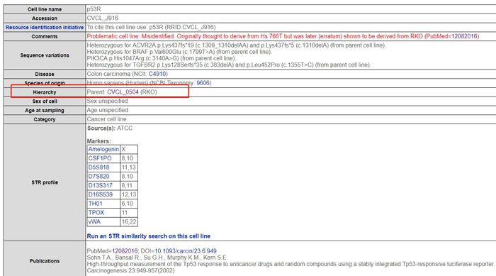 其次,在DSMZ中比中最高的p53R(CRL-2781)是什么细胞呢?经ATCC网站查询,发现CRL-2781这个编号细胞已经“被下架”不复存在了。ExPASy网站显示,p53R细胞来源于RKO(下图)。而DSMZ比中次高匹配的是RKO(CRL-2577),匹配度EV=0.92(34/37)。