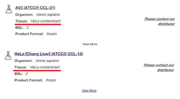 我们接着查看在ATCC和DSMZ与该细胞高度匹配的细胞“AV-3”和“Chang Liver”(注:编写文章时,HeLa.P3已经查无资料,DSMZ匹配度次高的细胞为 Chang Liver),发现这两株细胞都被标注为 HeLa 污染。在 ExPASy 数据库中也明确提示了MGC-803细胞可能存在 HeLa 污染呢。至此,我们可以确定,提交给客户的结论不变:不能排除有其他人源细胞污染的可能性