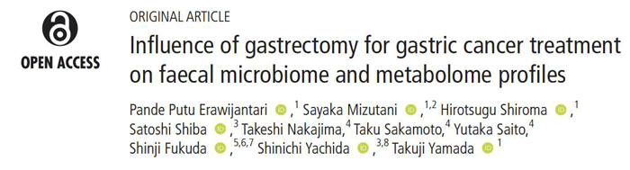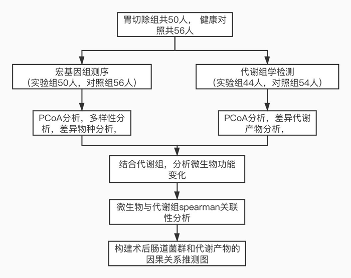胃切除术是一种治疗胃癌和病态肥胖的外科手术,众多研究表明术后粪便微生物组和代谢组改变会持续一段时间;特别是,这些改变与患者的术后并发症发生相关。该研究采用宏基因测序与代谢组学检测的方法对胃癌患者胃切除术后的肠道菌群变化进行研究。