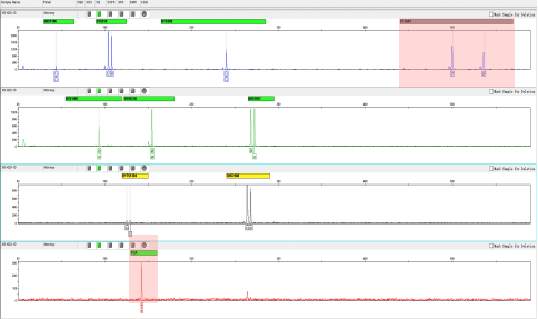 上图结果是没有任何污染的正常VERO细胞,10个位点全部在bin(灰色条带)上出单(纯合)或双峰(杂合)。人源位点;在人、猴相关高近缘物种都能有扩增产物,产物片段大小在人和猴之间具有明显差异。而如果是人源细胞则在F13A01位点不出峰。如有其他人或猴源污染,8个猴源位点中有3个位点出现3个或3个以上的峰。
