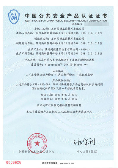 近期,苏州 ■澳门十大棋牌排行榜最新■澳门十大棋牌排行榜推荐 技术有限公司自主研发的MicroreaderTM 36A ID System法庭科学人类荧光标记STR复合扩增检测试剂顺利顺利获得中国公共安全产品(GA)认证,并取得了《中国公共安全产品认证证书》。本试剂符合全国公安机关最新打拐DNA数据库基因座要求及常染色体数据库建设规范和需求。可应用于打拐、建库、案件排查等方面。