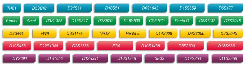 本试剂利用成熟的6色荧光标记技术,对36个常染色体基因座、1个Y染色体基因座和1个性别位点Amelogenin以及1个Y-indel进行复合扩增。完全满足最新的全国公安机关打拐DNA数据库基因座要求。