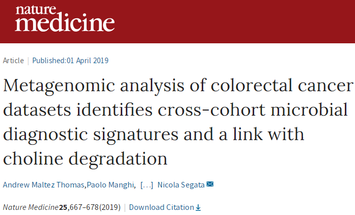 [1] Andrew Maltez Thomas et al., (2019) Metagenomic analysis of colorectal cancer datasets identifies cross-cohort microbial diagnostic signatures and a link with choline degradation. Nature Medicine. DOI: 10.1038/s41591-019-0405-7