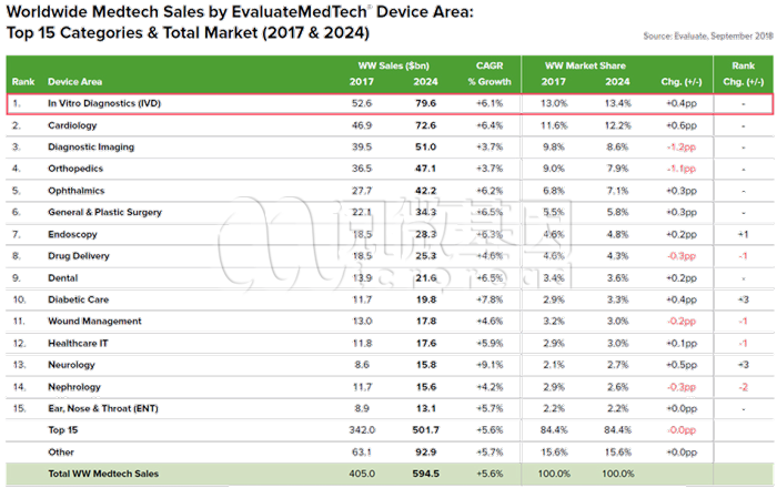据Evaluate MedTech发布的《World Preview 2018, Outlook to 2024》显示,2017年全球医疗器械市场销售额为4050亿美元,预计2024年达到5945亿美元,年复合增长率为5.6%;IVD领域的销售额位列医疗器械细分领域中的第一位,2017年销售额约526亿美元,占医疗器械整体市场的13.0%,预计2024年销售额将提升至796亿美元,开展势头一片大好。