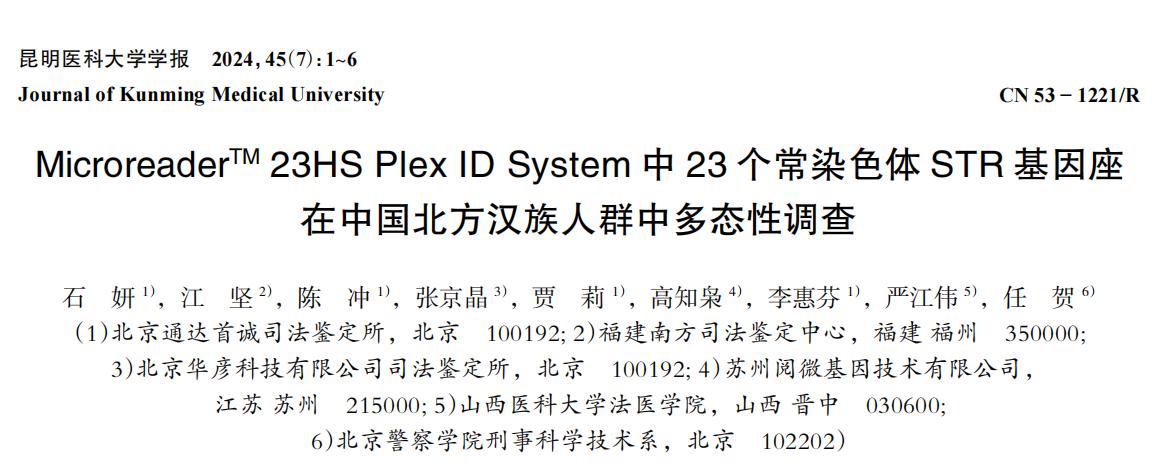 石妍,江坚,陈冲,张京晶,贾莉,高知枭,李惠芬,严江伟,任贺. MicroreaderTM 23HS Plex ID System中23个常染色体STR基因座在中国北方汉族人群中多态性调查[J].昆明医科大学学报,2024,45(7):154-159.doi: 10.12259/j.issn.2095-610X.S20240723