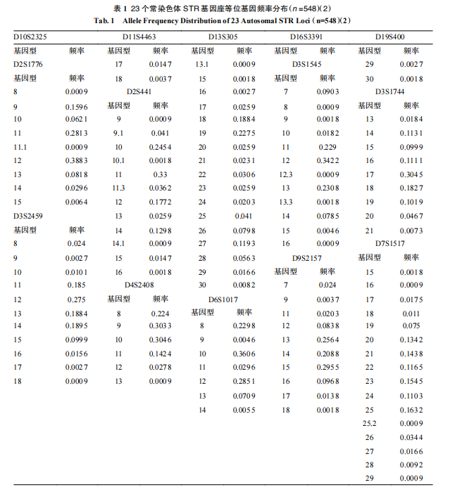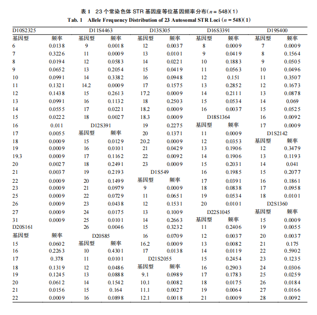 548例无关样本的23个常染色体基因座共检出260个等位基因,单个基因座等位基因分型数量介于6个(D4S2408)~23个(D10S2325),等位:基因的频率分布在0.000 9~0.590 2之间见表1: