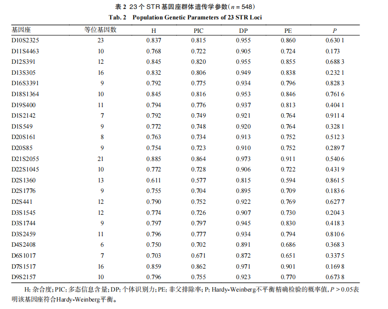 调查对象来源于北方汉族人群中无关DNA样本548例,调查23个基因座的遗传多态性和法医学参数;按照 MicroreaderTM 23HS Plex ID System试剂盒说明书进行PCR复合扩增;扩增产物顺利获得ABI 3500XL遗传分析仪进行电泳检测,检测结果使用 GeneMapper ID-X v1.5软件进行分析。